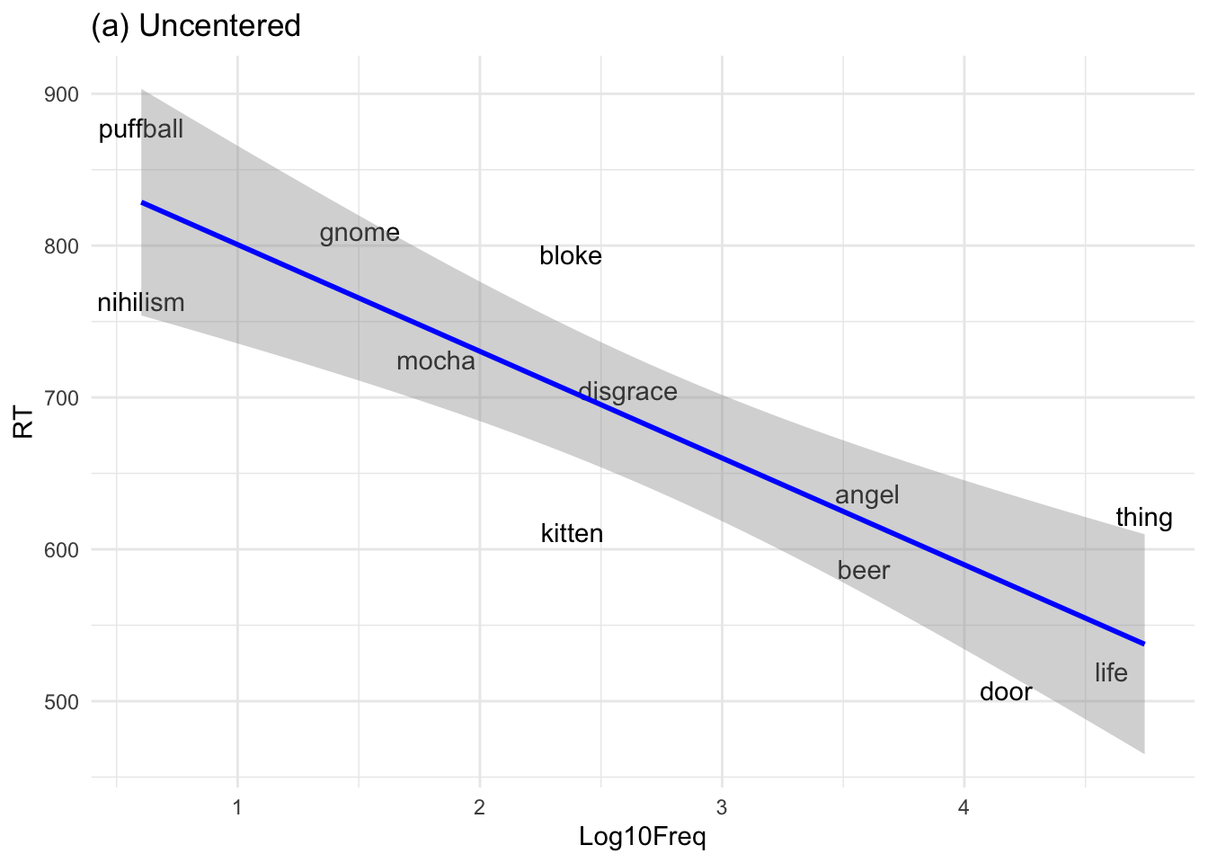# Plot with uncentered log frequencyELP %>%ggplot(aes(x = Log10Freq, y = RT)) +geom_text(aes(label = Word)) +geom_smooth(method ="lm", color ="blue") +ggtitle("(a) Uncentered") +theme_minimal()