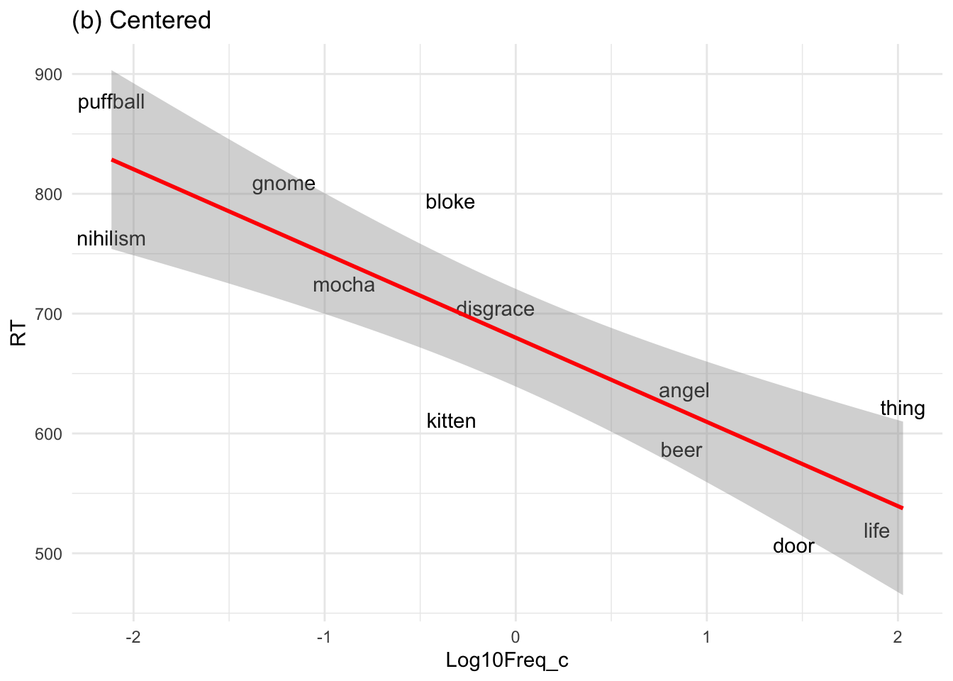 # Plot with centered log frequencyELP %>%ggplot(aes(x = Log10Freq_c, y = RT)) +geom_text(aes(label = Word)) +geom_smooth(method ="lm", color ="red") +ggtitle("(b) Centered") +theme_minimal()