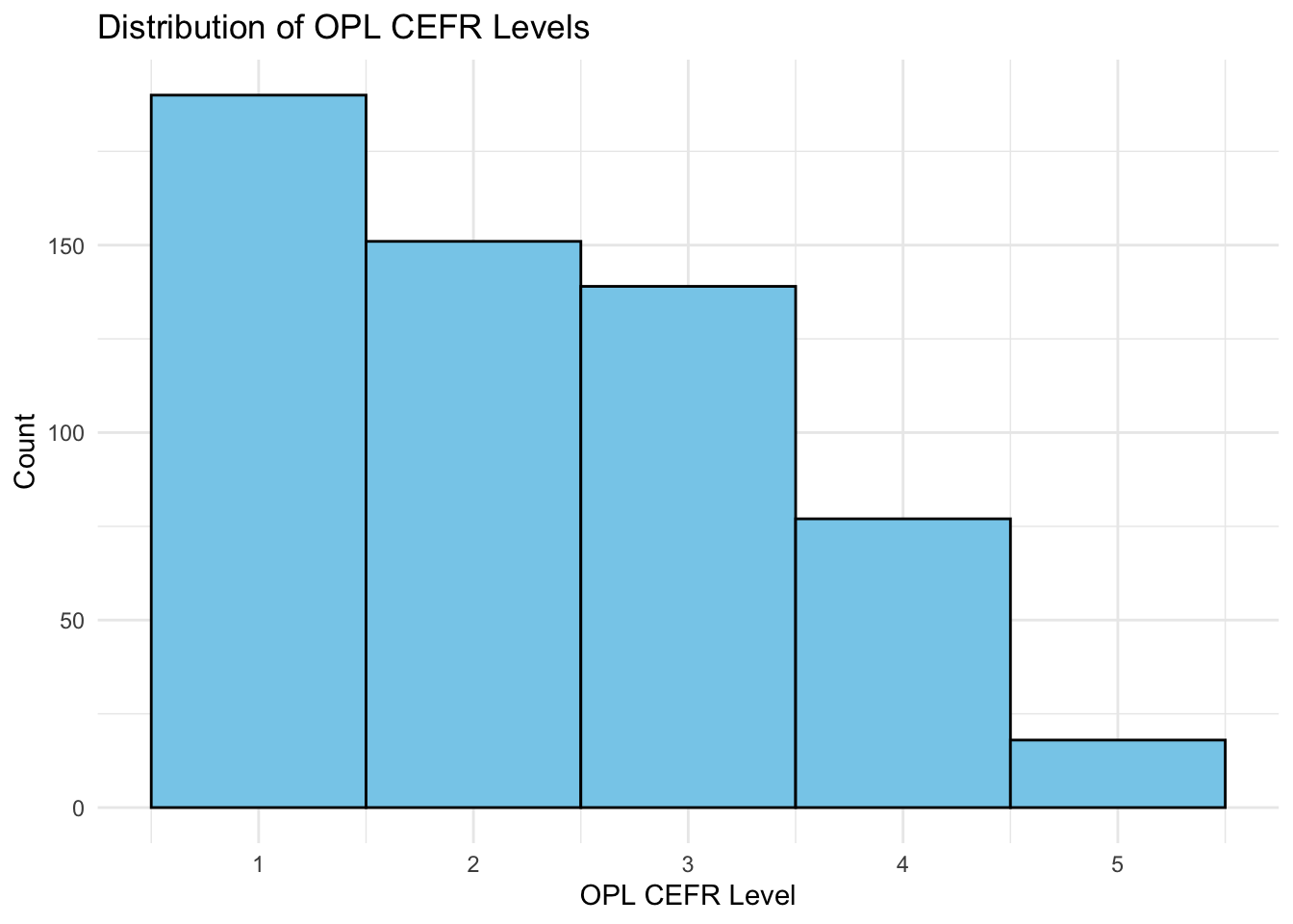 data$OPL_lab <-factor(data$OPL_CEFR, levels =1:5)data$NICT_lab <-factor(data$NICT_CEFR, levels =1:5)# Histogram for OPL CEFRggplot(data, aes(x = OPL_CEFR)) +geom_histogram(binwidth =1, color ="black", fill ="skyblue") +labs(title ="Distribution of OPL CEFR Levels", x ="OPL CEFR Level", y ="Count") +theme_minimal()