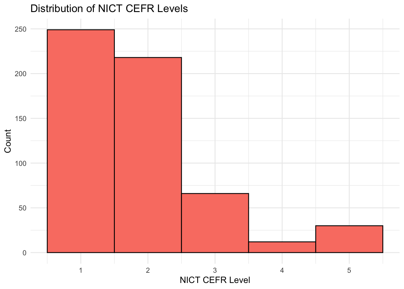 # Histogram for NICT CEFRggplot(data, aes(x = NICT_CEFR)) +geom_histogram(binwidth =1, color ="black", fill ="salmon") +labs(title ="Distribution of NICT CEFR Levels", x ="NICT CEFR Level", y ="Count") +theme_minimal()