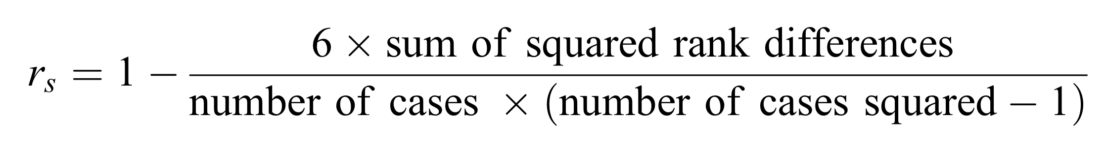 # Manual calculationOPL_rank <-rank(data$OPL_CEFR)NICT_rank <-rank(data$NICT_CEFR)# Differences of ranksd <- OPL_rank - NICT_rank# Square the differencesd2 <- d^2# Sum of squared differencessum_d2 <-sum(d2)# Number of observationsn <-nrow(data)# Using the formular_s_manual <-1- (6* sum_d2) / (n * (n^2-1))r_s_manual