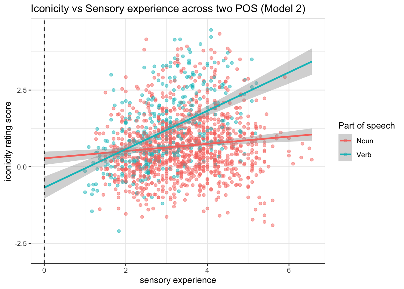 title = "Iconicity vs Sensory experience across two POS (Model 2)",